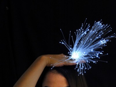 Optické vlákno, stříbro, stříbřená mosaz, světelný zdroj. Otočením lůžka optických vláken se rozsvěcí a zhasíná. Napájení - knoflíkové baterie.