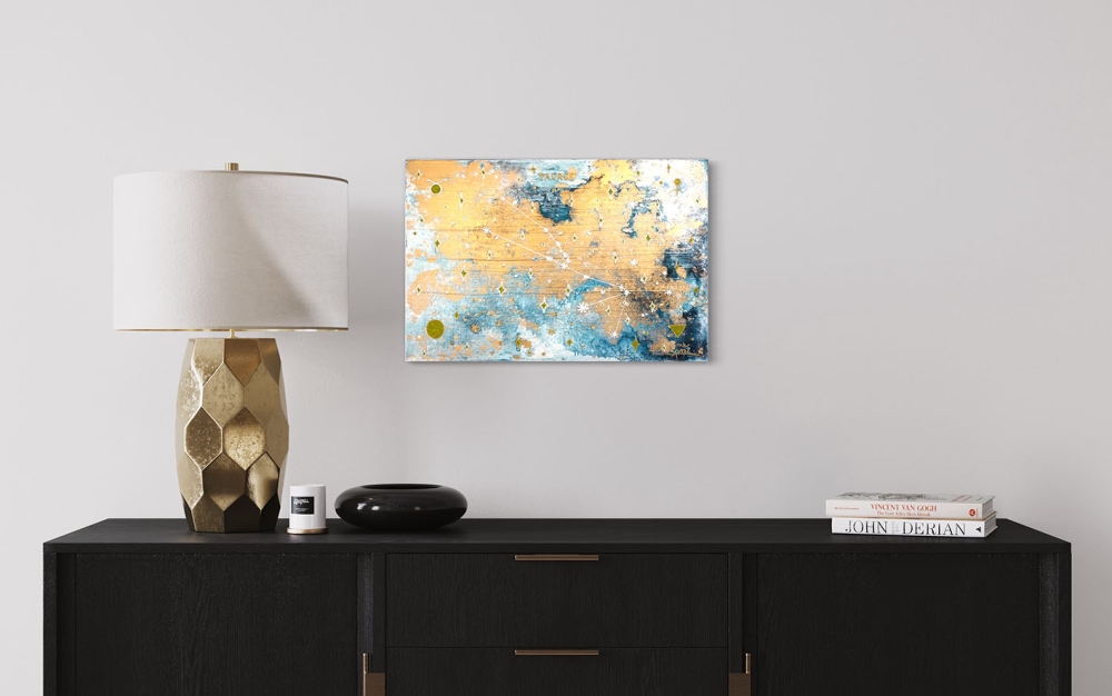 This horoscope inspired artwork was created with the perception of ourselves in mind, as a reminder for every day of self-love and self-acceptance in all aspects. A vibrant combination of blue, gold and white with stars, the constellation of the sign, completed with the symbols and colour attribute of the sign. Thanks  the special technique of using metallic effects, the paintings change as the viewer passes by and seem to flicker, adding to the magic of reminding the viewer of self-awareness at just the right moments. They can also work very well for Feng Shui purposes, for example two paintings above a couple's bed.