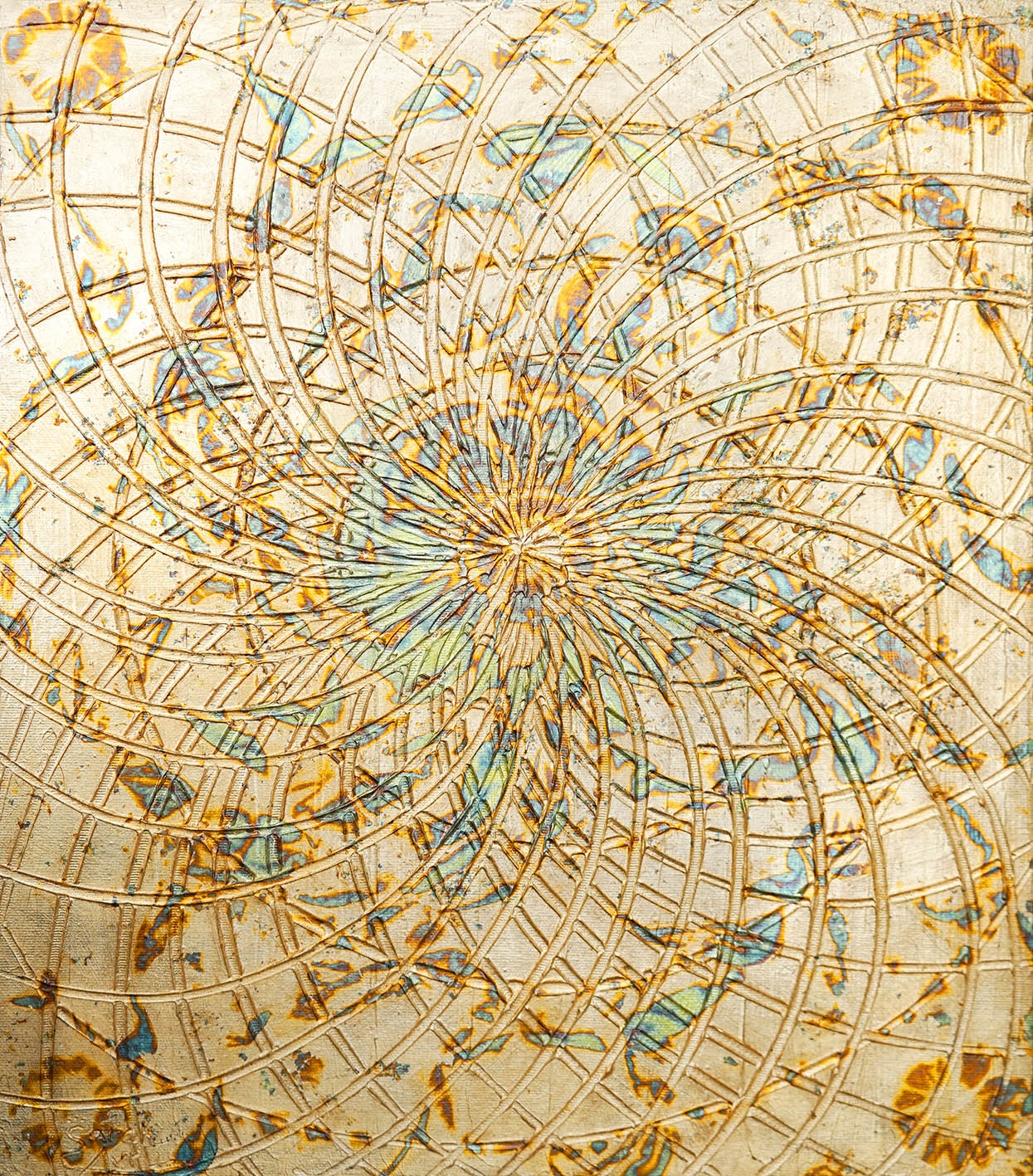 This golden metallic painting comes from the Genesis collection and symbolizes new beginnings and infinite abundance. The basic element is the Fibonacci spiral, which is also a symbol of sacred geometry known as golden spiral. Sacred geometry encompasses the sacred universal patterns used to design everything in our reality and represents the connection between the microcosm and the macrocosm. These paintings are like sun or a fireplace in the room thanks to the radiant warmth that emanates from them.