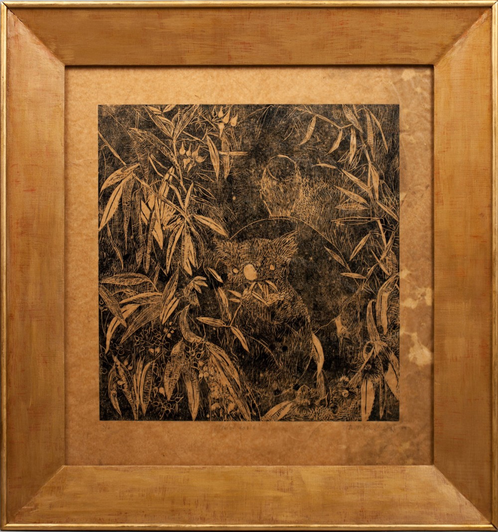 Linoryt - kombinovaný tisk (výška, hloubka), rámováno (antireflexni sklo, dřevěný rám).