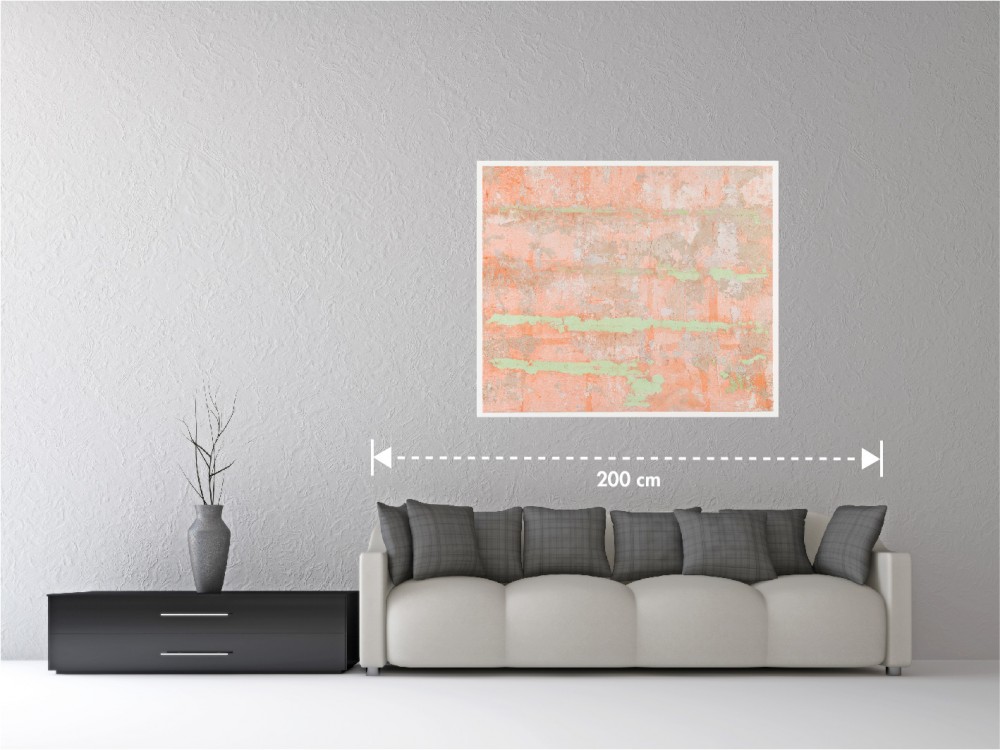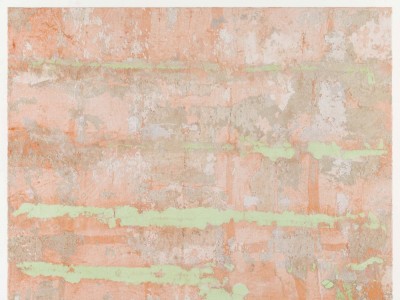 Gázotisk – otisk stěny. Vápno, pigmenty, gáza, lepidlo, napnuto na plátno a blindrám.