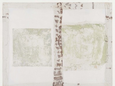 Gázotisk – otisk stěny. Vápno, pigmenty, gáza, fáč s krví, lepidlo, napnuto na plátno a blindrám.