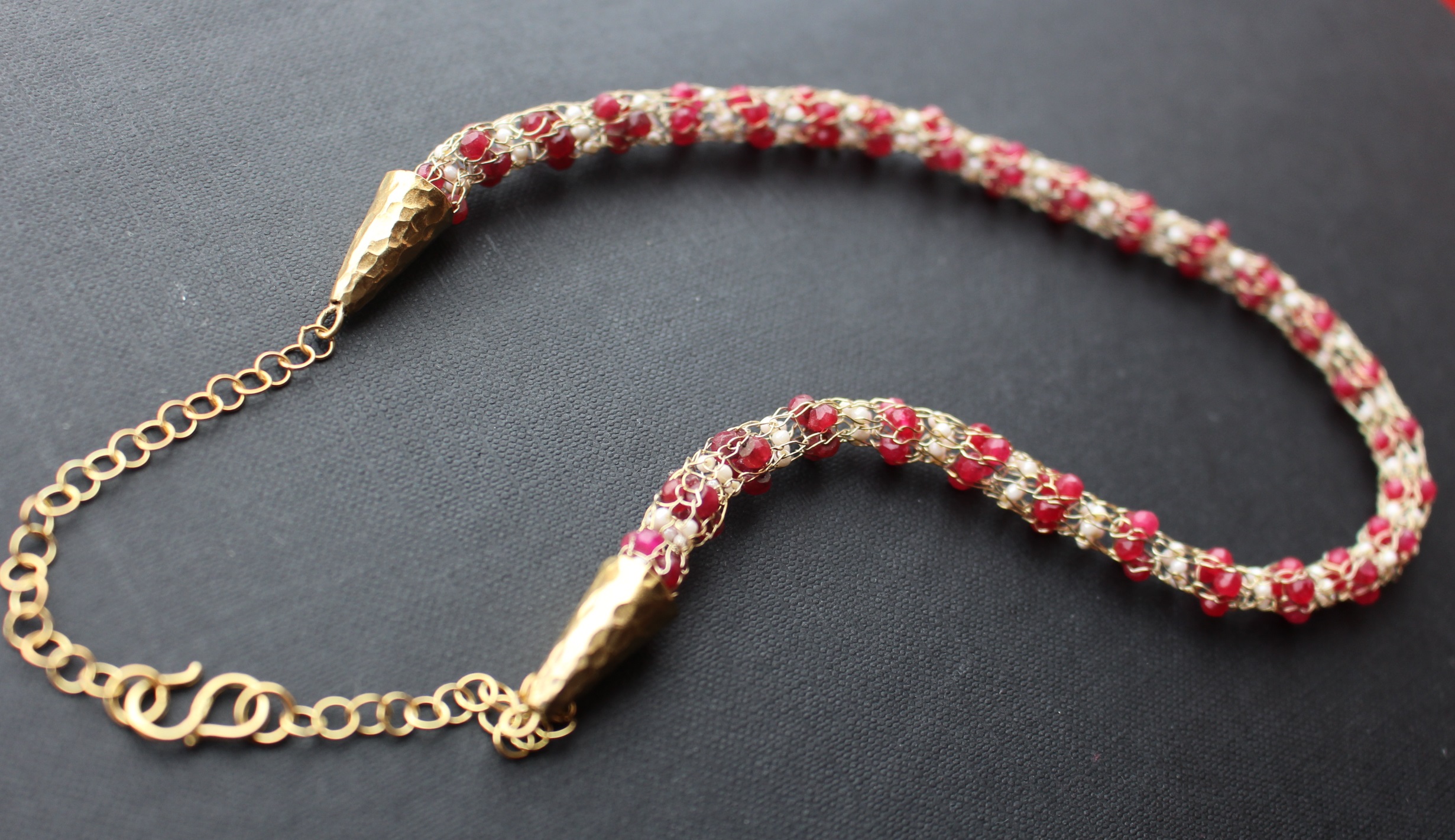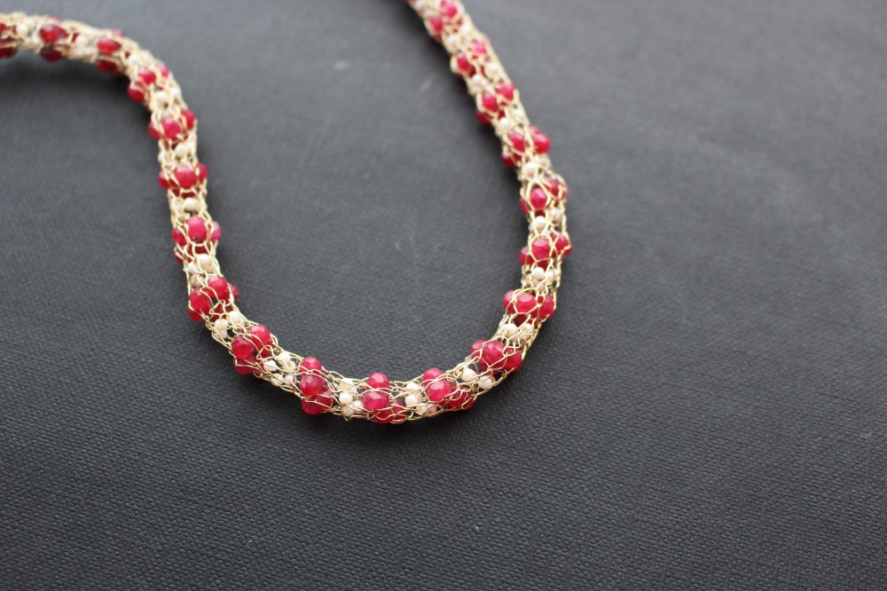 Pozlacený stříbrný náhrdelník z ručně splétaného stříbrného drátku, broušených rondelek rubínu a drobných říčních perel. Možnost zapnutí mezi 42 a 49 cm. Stříbro  925/ 1000, zlaceno 14k žlutým zlatem. Váha 17,5 g, délka 49 cm.