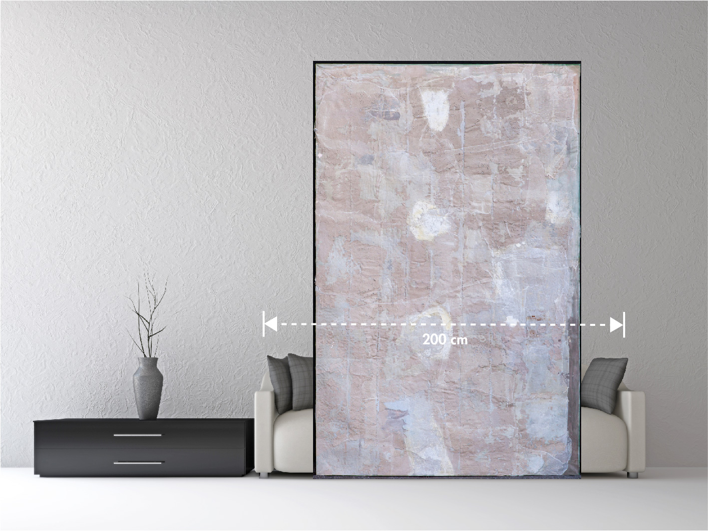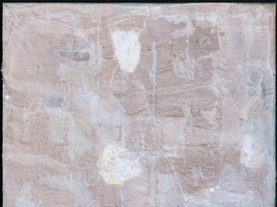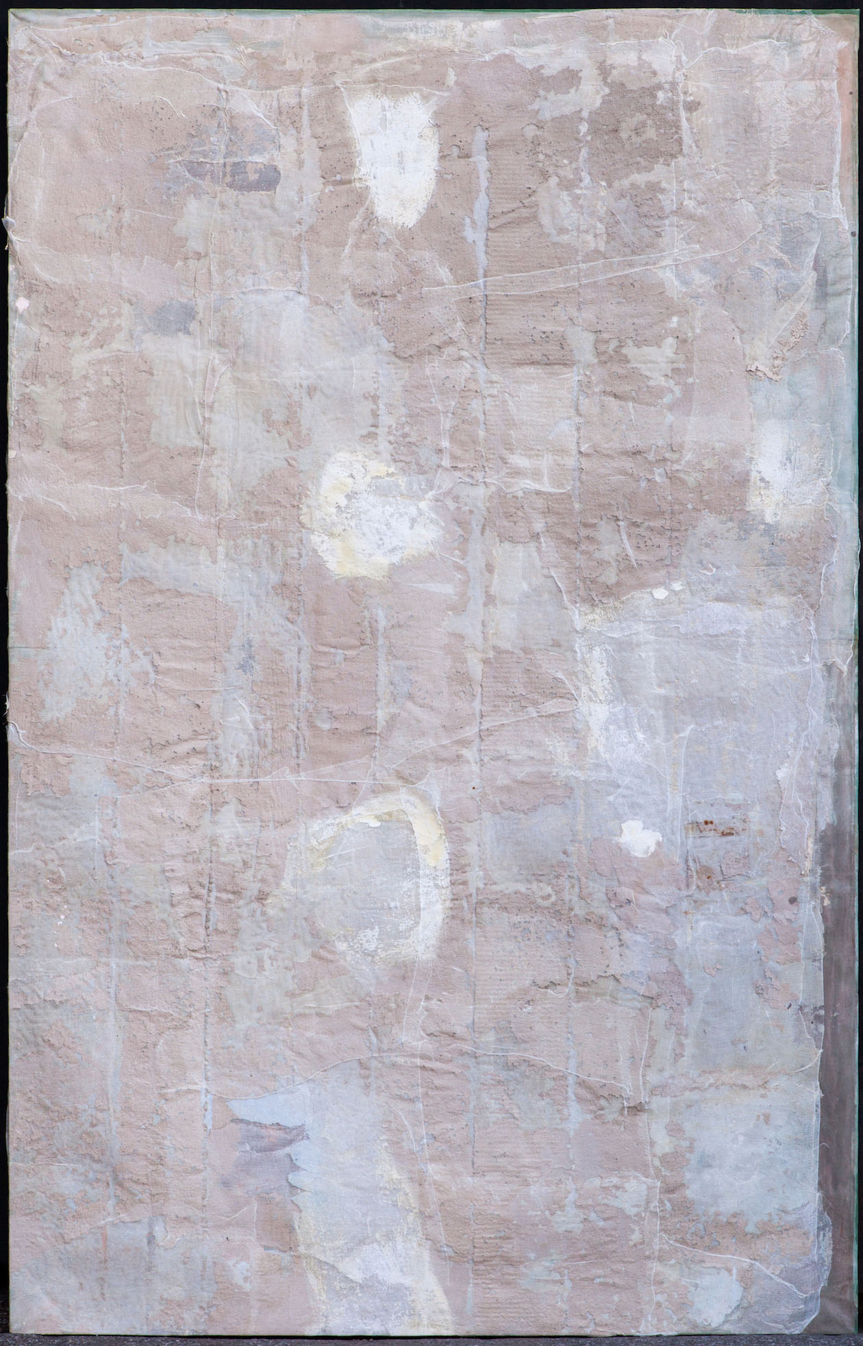 Gázotisk - otisk ze stěny. Vápno, pigmenty, gáza, lepidlo, napnuto na plátno a blindrám.