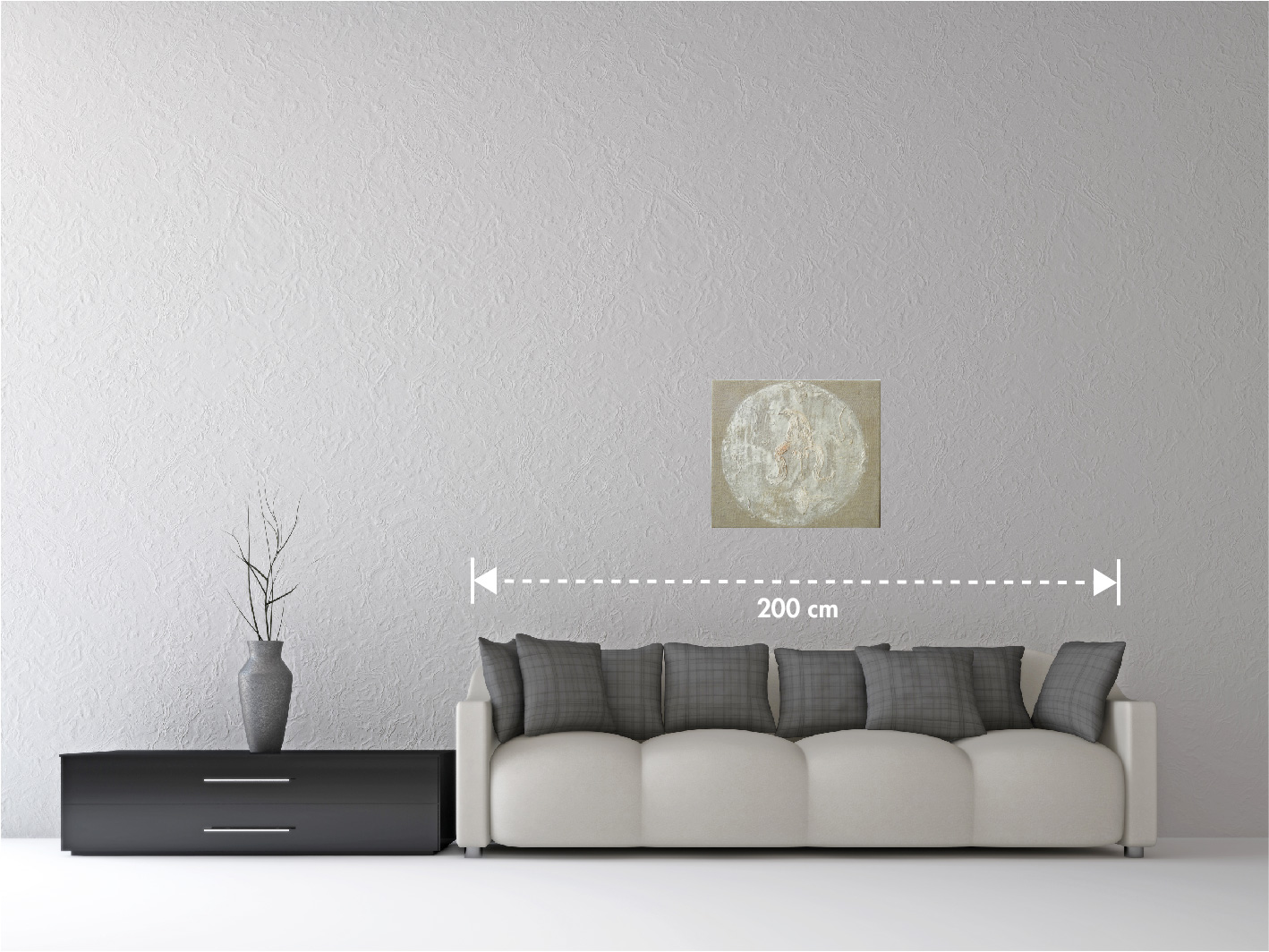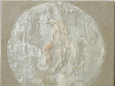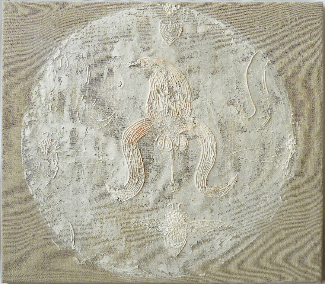 Gázotisk – otisk stěny. Vápno, pigmenty, gáza, vosk, lepidlo, napnuto na plátno a blindrám.