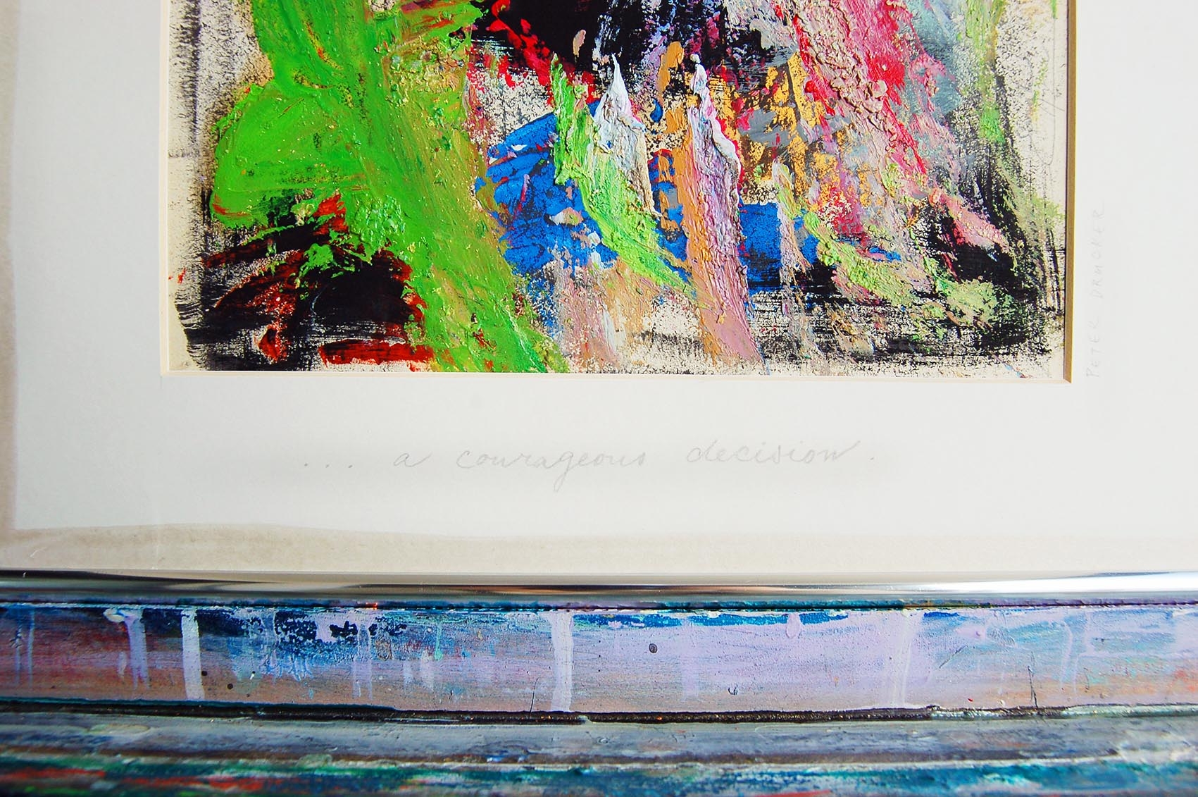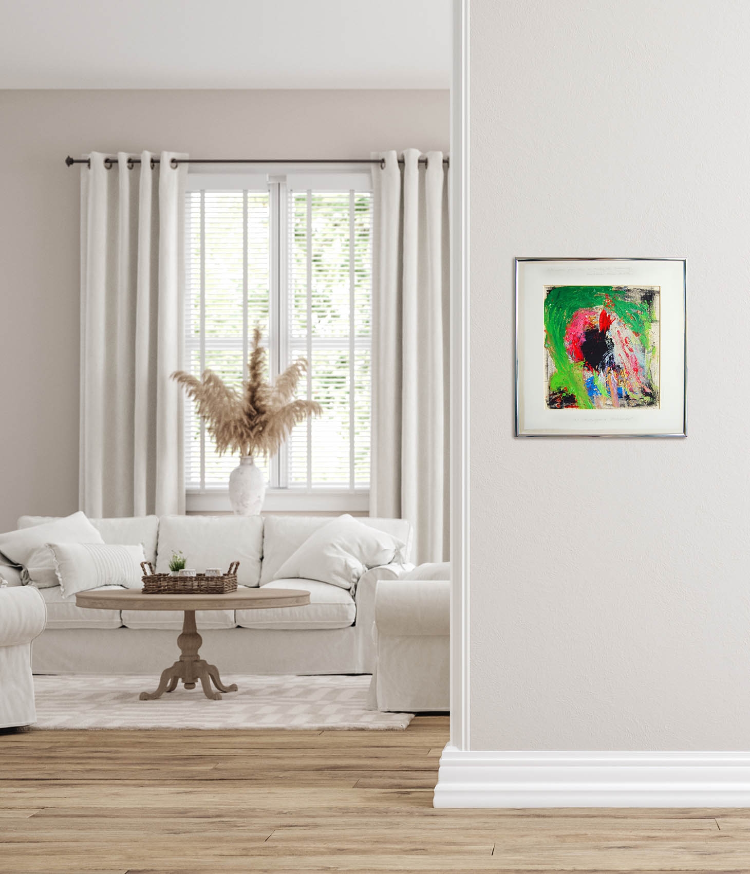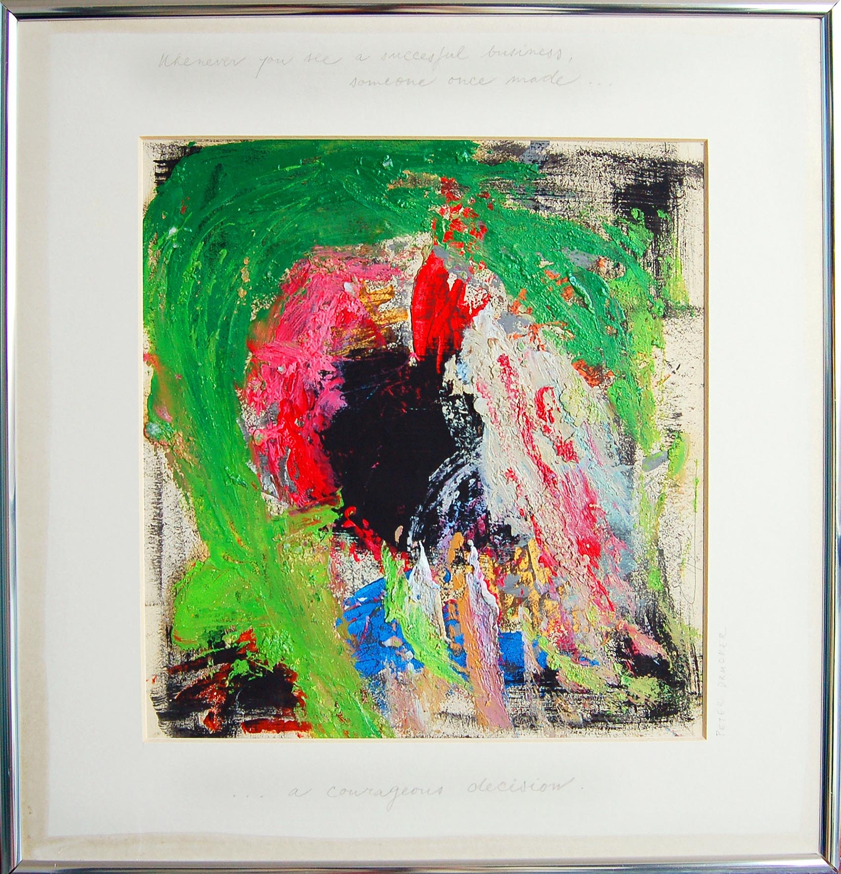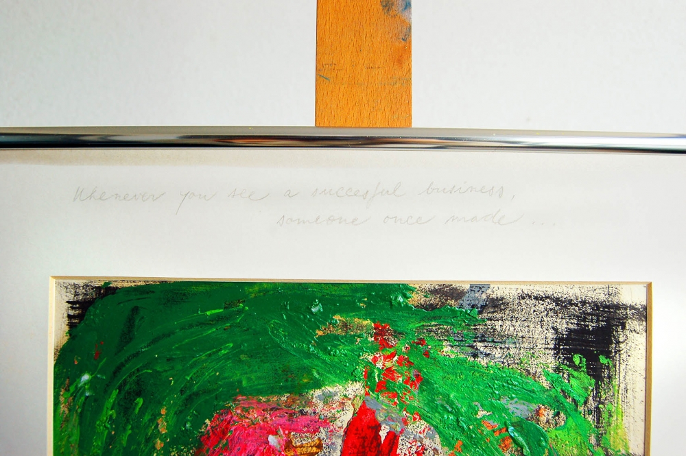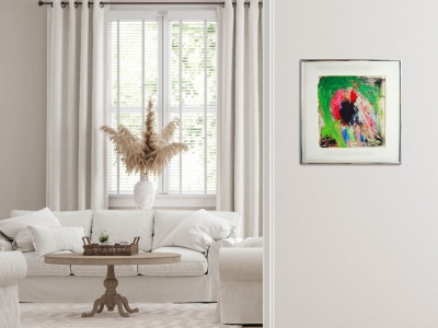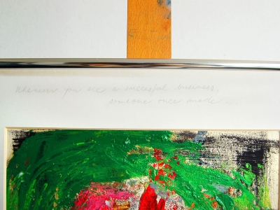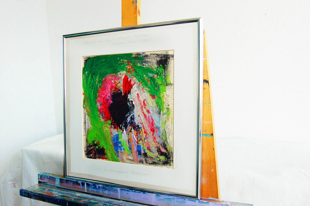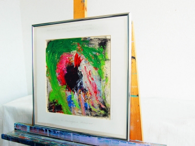 Any painting from this collection is a pure extract of being led by "from above". It is an experiment with my approach towards creation. Some of these paintings have been evolved for 17 years. Usually, the artist paints focusing on the vision of what he wants to depict on the canvas. He considers the composition, colours, structures and the main idea. When working on these little (big) pieces, I let myself be carried away. When developing these paintings, I would freely scribble on high-quality papers placed around, without considering matching colours or anything else. The final outcome is completed by handwritten texts. Whether it being a supportive quote, poem or lyrics, I have always been extremely lucky in finding a fitting text for each and every painting. Each art piece is covered by glass and in frame.