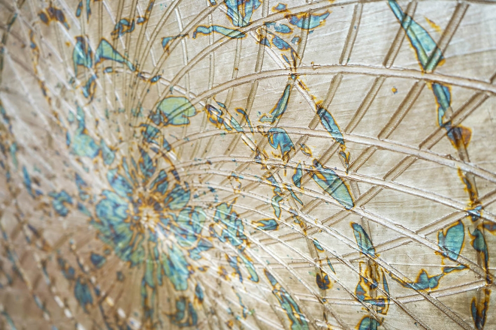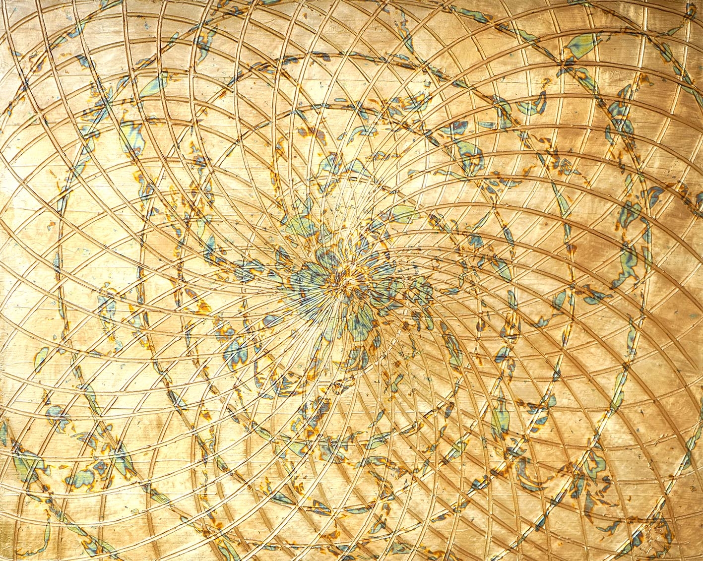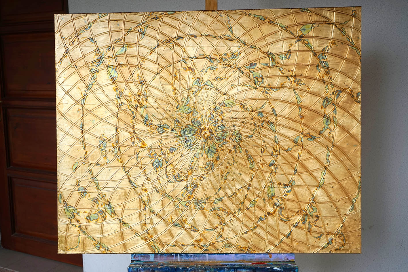 This golden metallic painting comes from the Genesis collection and symbolizes new beginnings and infinite abundance. The basic element is the Fibonacci spiral, which is also a symbol of sacred geometry known as golden spiral. Sacred geometry encompasses the sacred universal patterns used to design everything in our reality and represents the connection between the microcosm and the macrocosm. These paintings are like sun or a fireplace in the room thanks to the radiant warmth that emanates from them.