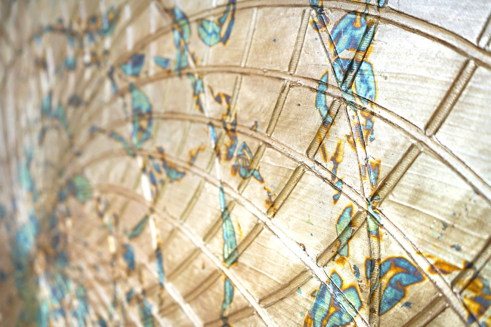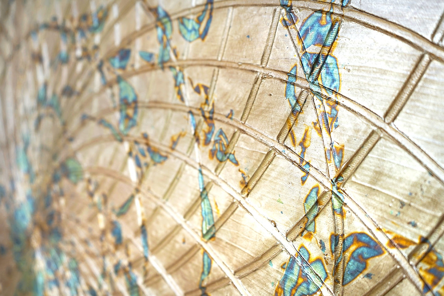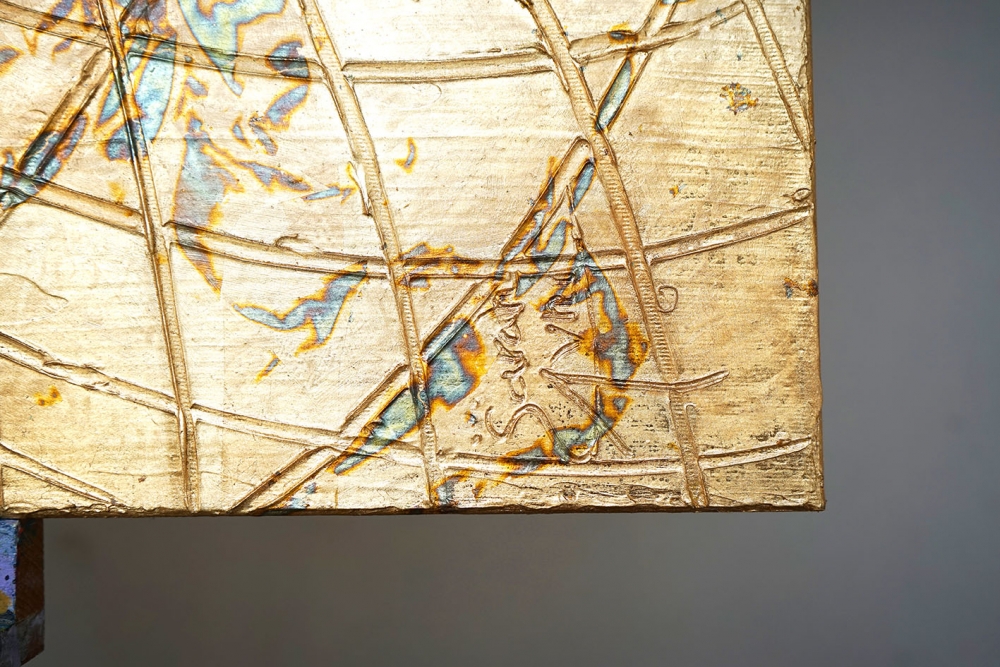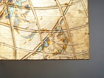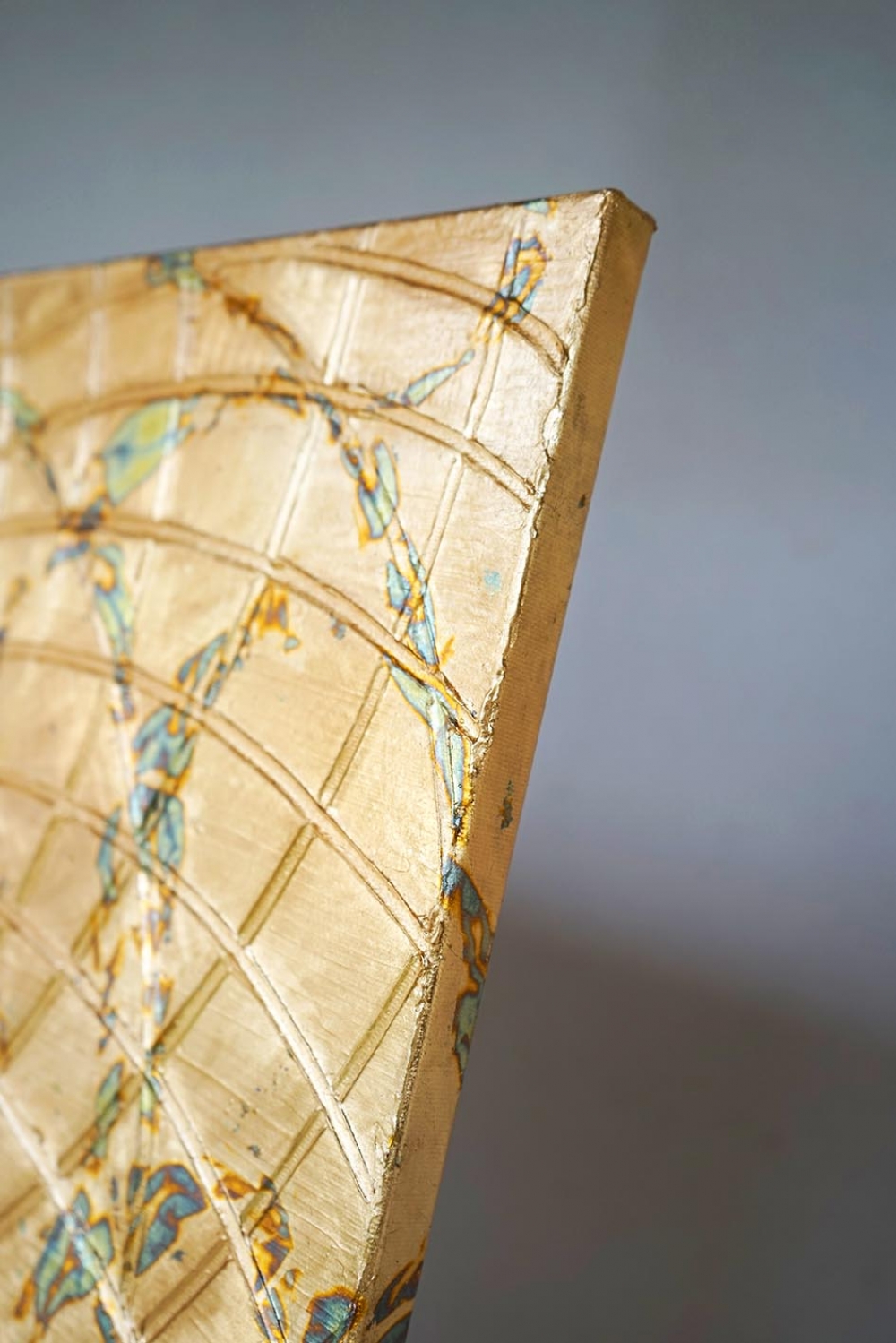 This golden metallic painting comes from the Genesis collection and symbolizes new beginnings and infinite abundance. The basic element is the Fibonacci spiral, which is also a symbol of sacred geometry known as golden spiral. Sacred geometry encompasses the sacred universal patterns used to design everything in our reality and represents the connection between the microcosm and the macrocosm. These paintings are like sun or a fireplace in the room thanks to the radiant warmth that emanates from them.