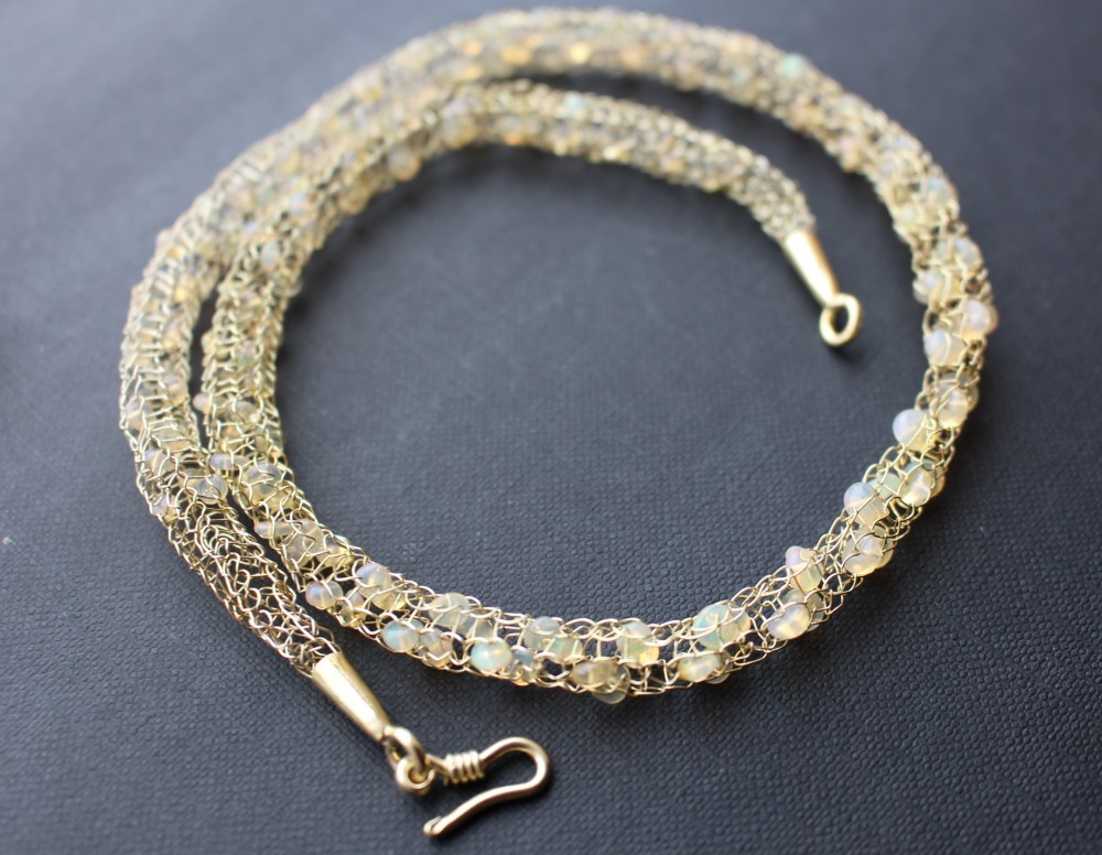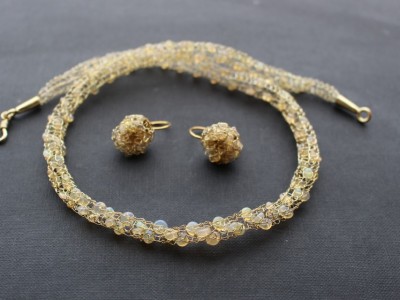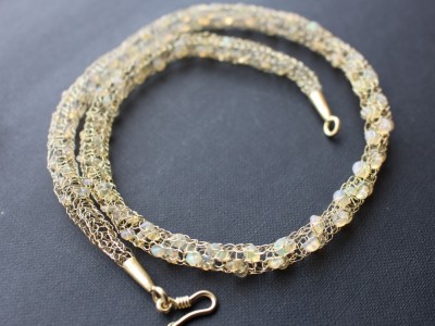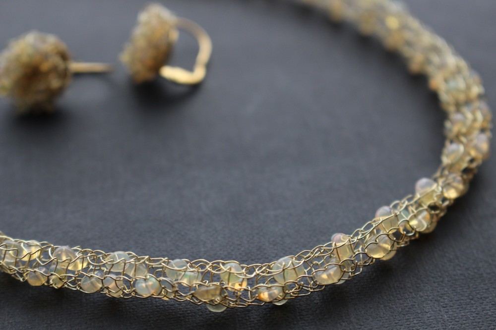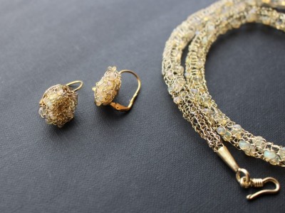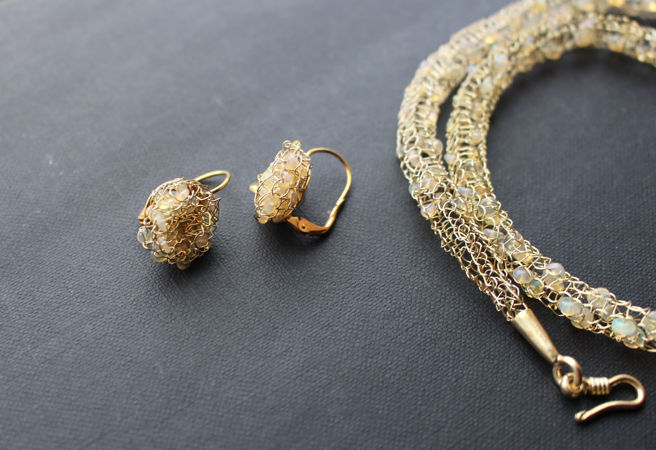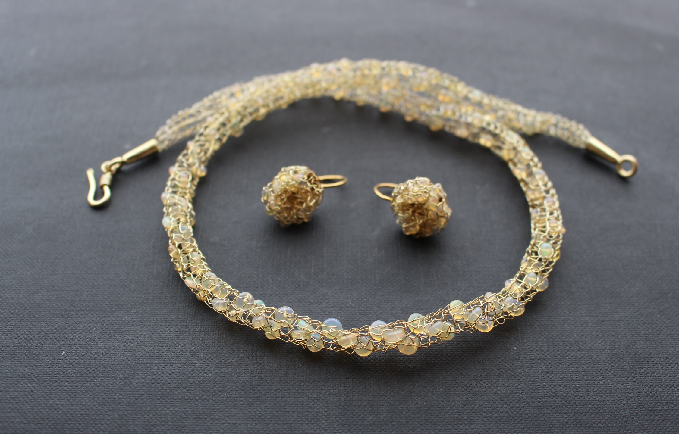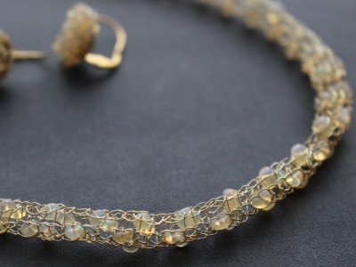 Pozlacená stříbrná souprava z ručně splétaného drátku a hladkých rondelek etiopského velo opálu s nádhernými duhovými odlesky do zlatava, zelena a modra. Náhrdelník má zapínání na háček, náušnice klasické zapíná na západku. Stříbro 925/1000, zlaceno 14 k žlutým zlatem. Váha náhrdelníku 12,15 g, náušnic 3,4 g. Délka náhrdelníku 48 cm, náušnic 2 cm.