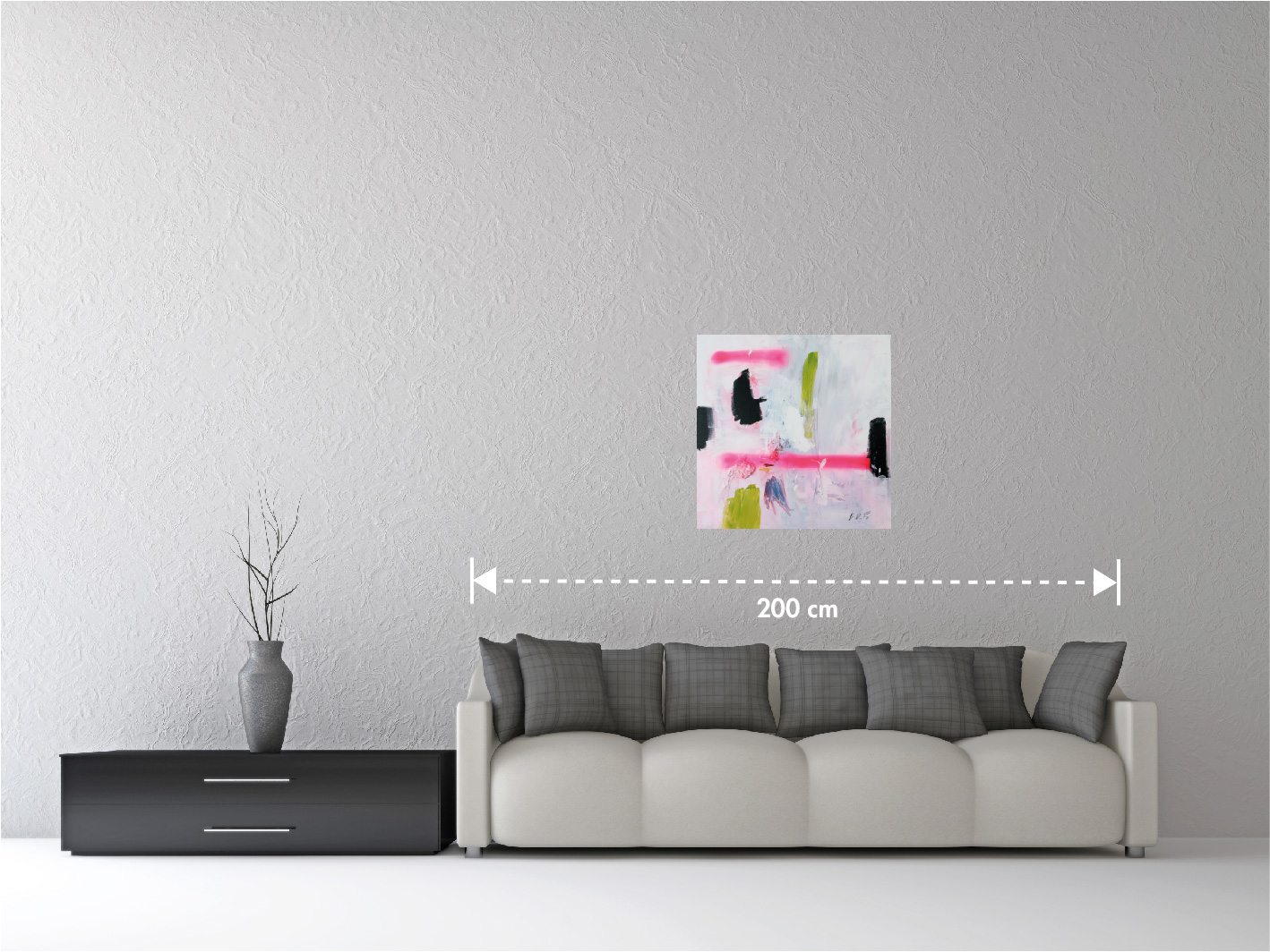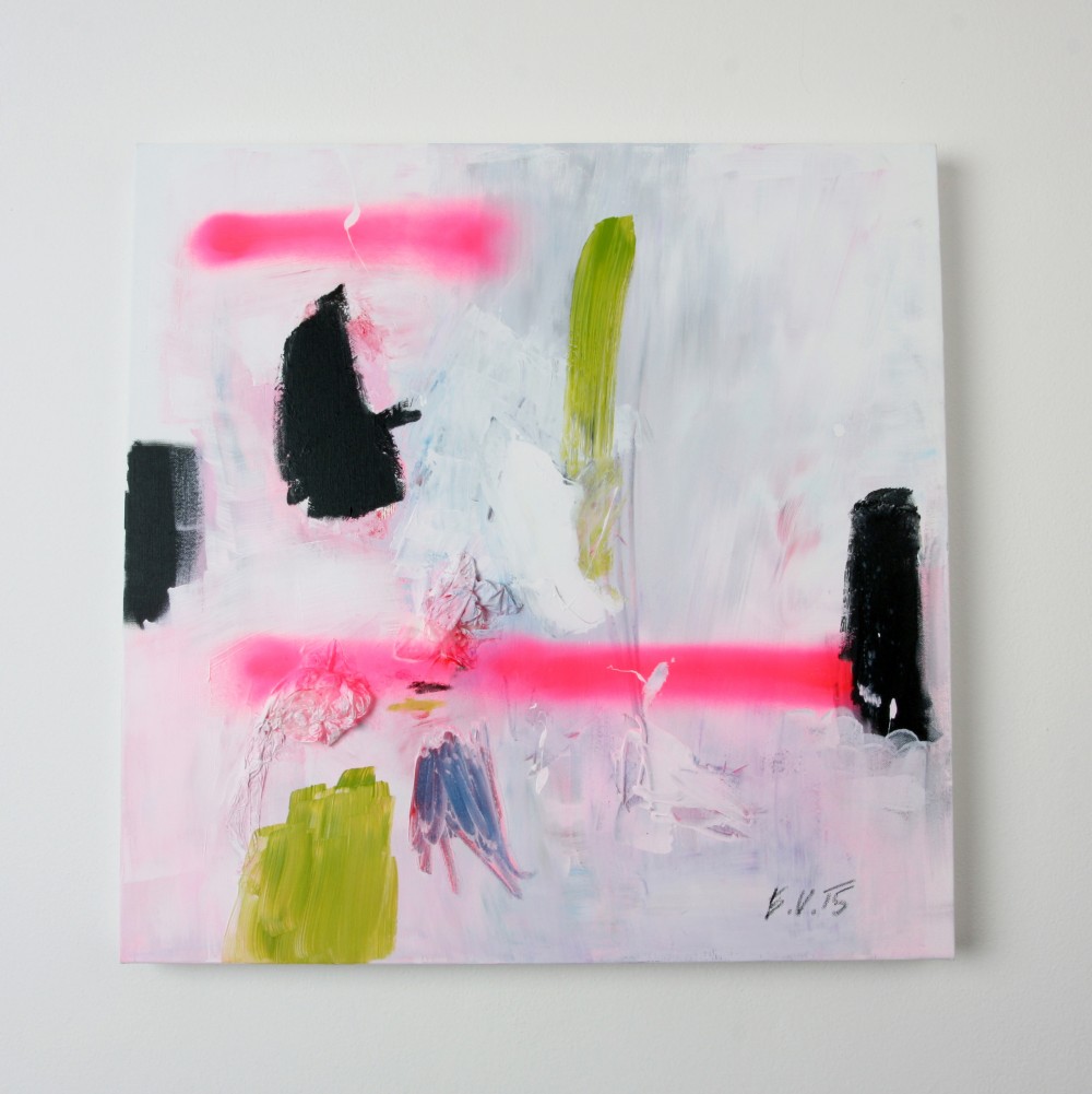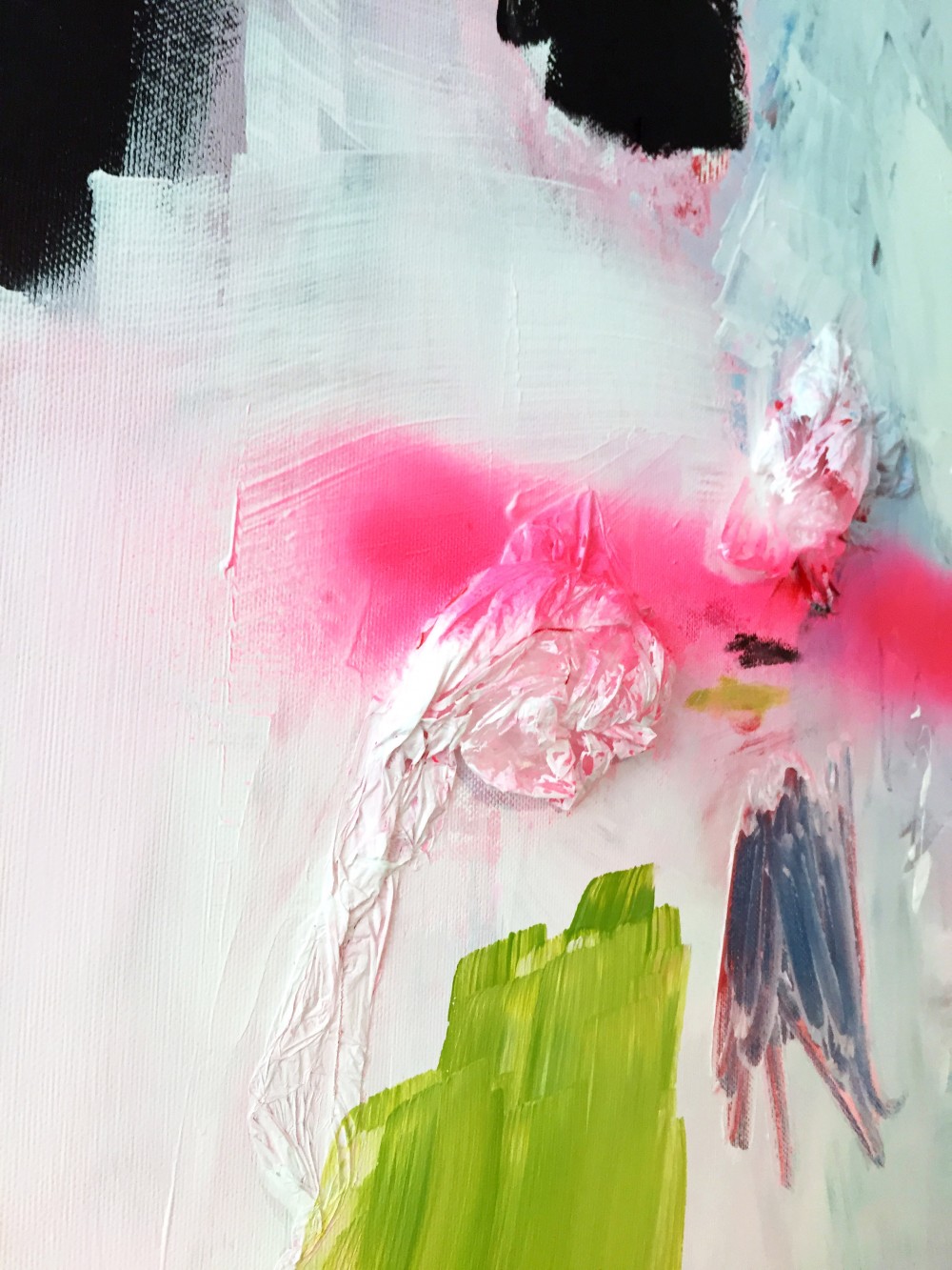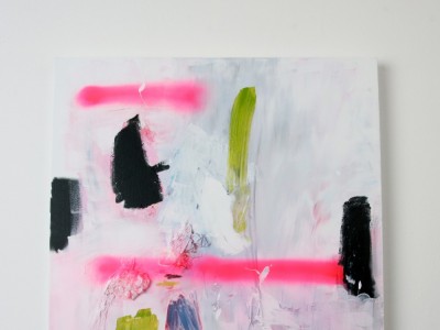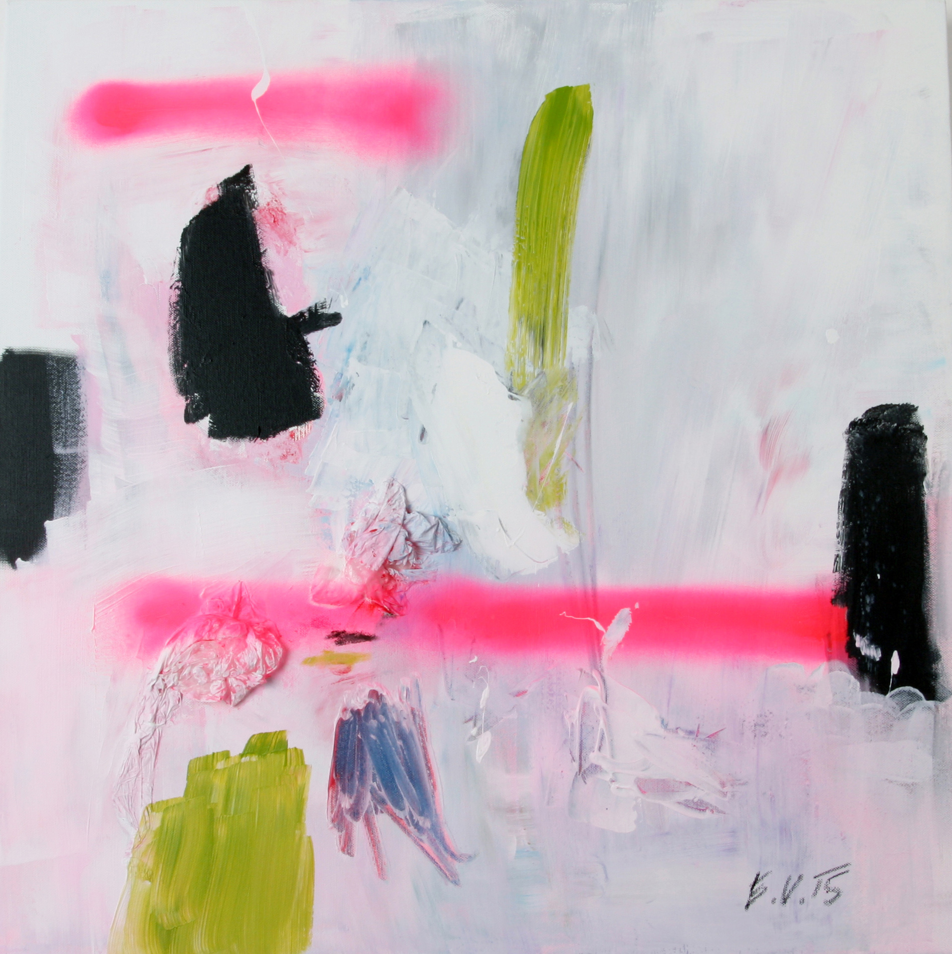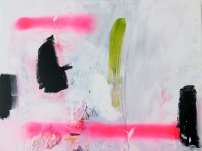kombinovaná technika na plátně: akryl, lepící páska, plast, olejové pastely a sprej