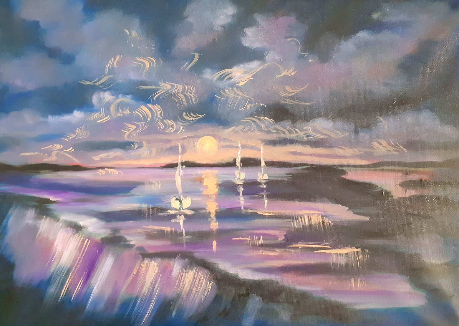 Prostřednictvím aktů poukazuje na ženskou energii a někdy až provokativní smyslnost. Západ slunce, loďka na moři nebo barvitá krajina, působí na nitro pozorovatele obrazu, navozují harmonii a spojení se zobrazovaným místem. Motivy tanečníků silně rezonují s prostředím, ve kterém se malířka pohybuje část svého života. V abstrakcích se objevují motivy z východních filosofií a dokonce i v obrazech zátiší je rozpoznatelná atmosféra daného okamžiku…