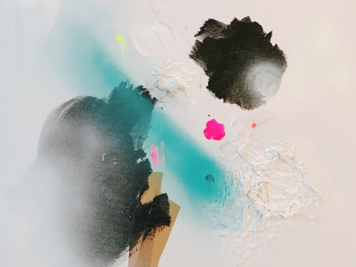 mixed media on canvas: acrylic, plastic, adhesive tape, oil pastel and spray